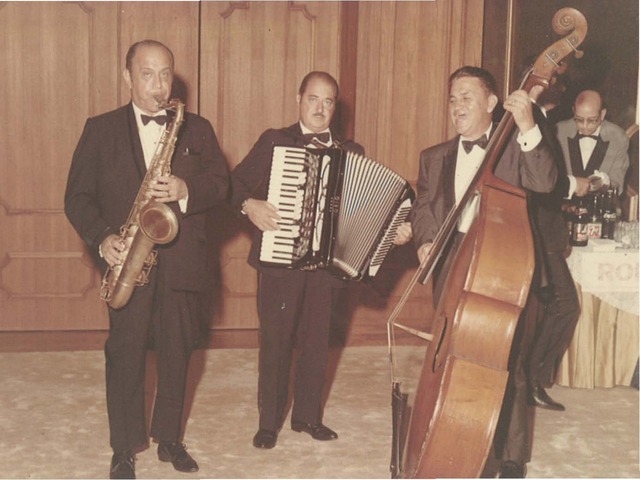 This story is actually about my parents, Josie and Lou Adler. My mom and dad really made an impact in Miami musically. In the pictures, you will see a photo of my dad at the Deauville Hotel on Miami Beach where he was the head of the Lou Adler Orchestra. He also played the bass fiddle at the Delano, Saxony, and the Americana, to name a few. Those were great days.